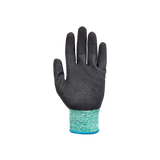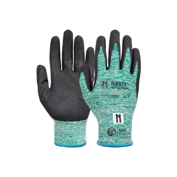 Grøn med sort belægning. Belægning af opskummet nitril. Har et godt greb og en god pasform. Fremstillet med rPET.