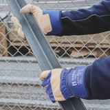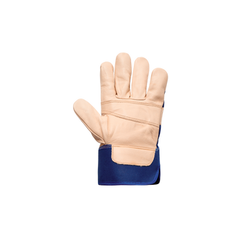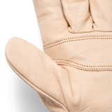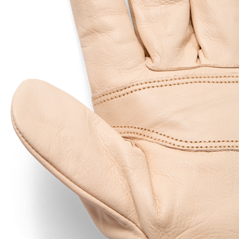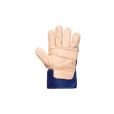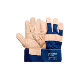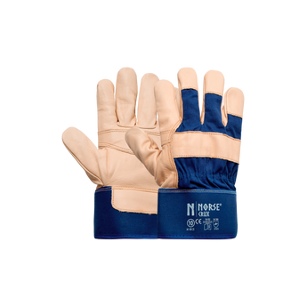 Strapazierfähiger Arbeitshandschuh aus Rindsleder, das mit der Zeit weicher wird. Der Handschuh hat einen Handrücken aus Segeltuch mit eingenähtem Gummiband am Handgelenk. Teile des Handrückens sind mit Rindsleder verstärkt.