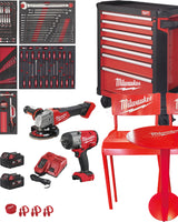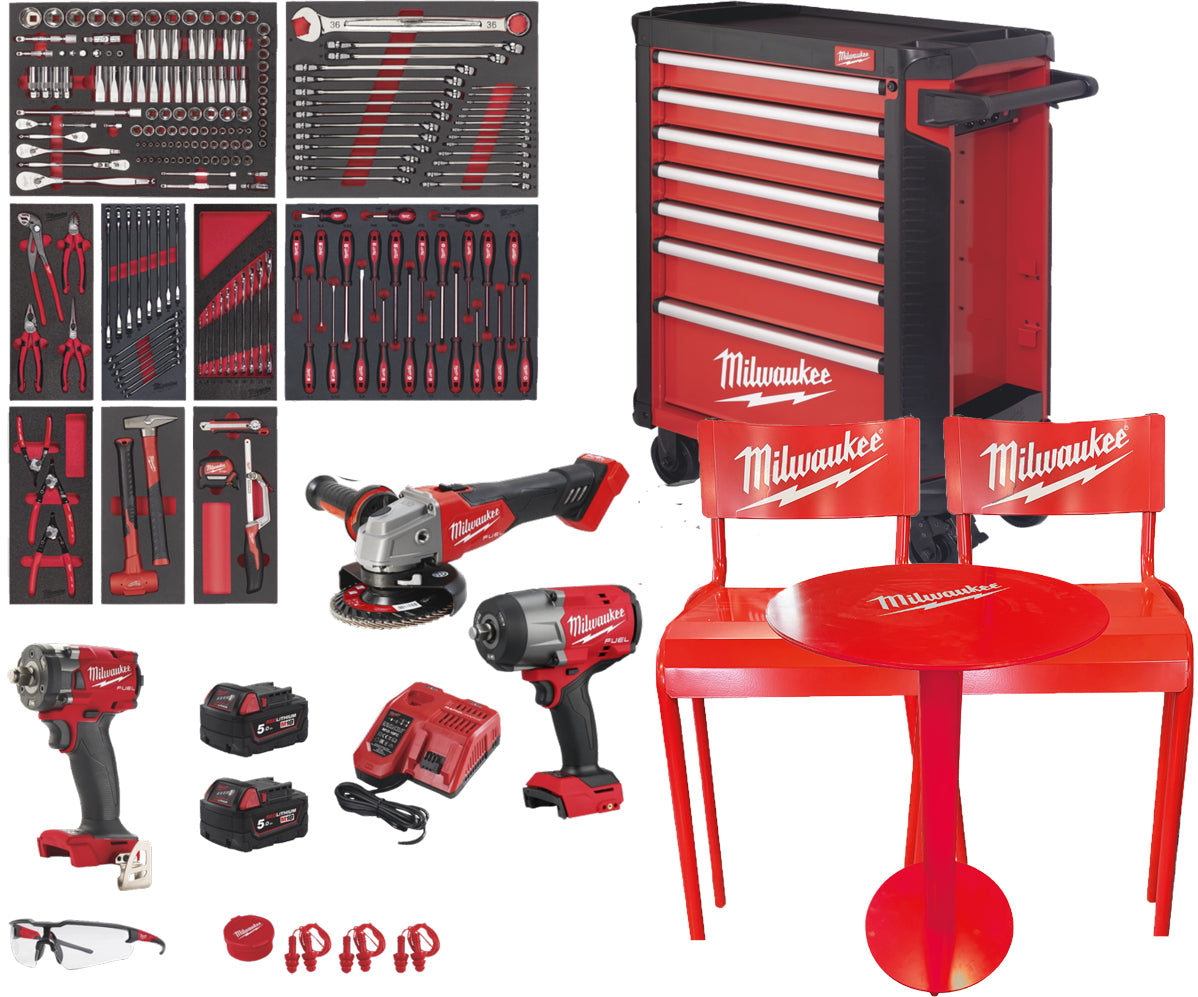 Værkstedsvogn med 7 skuffer leveret med 246 dele værktøj. Inkl. slagnøgle ½” M18 FIW2F12-0, M18 FMTIW2F12-0, vinkelsliber 125 mm M18 FSAG125X-0, hurtiglader og 2 × 5,0 Ah. Bliver leveret med Milwaukee cafesæt, 2 stole og bord.